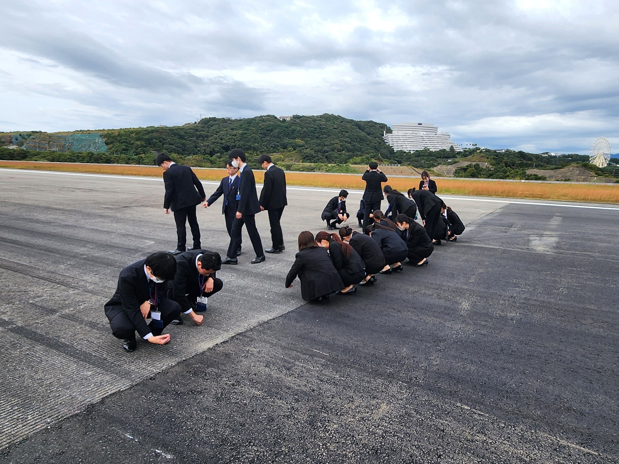 令和7年度は11月に実施しました。バスで南紀白浜空港まで移動し、管制塔で航空管制運航情報官が飛行場対空援助業務を行うところを間近で見ることができました。「飛行場対空援助演習」のモデル空港である南紀白浜空港において、航空機へ情報提供を行う航空管制運航情報官の姿を見ることができ、保安大での研修が業務に直結していることを感じるとともに今後の演習への意気込みが高まりました。また、滑走路上にバスで入り、「飛行場情報運用論」等で学習した滑走路面のグルービング(路面排水のために加工された溝)を確認することもできました。