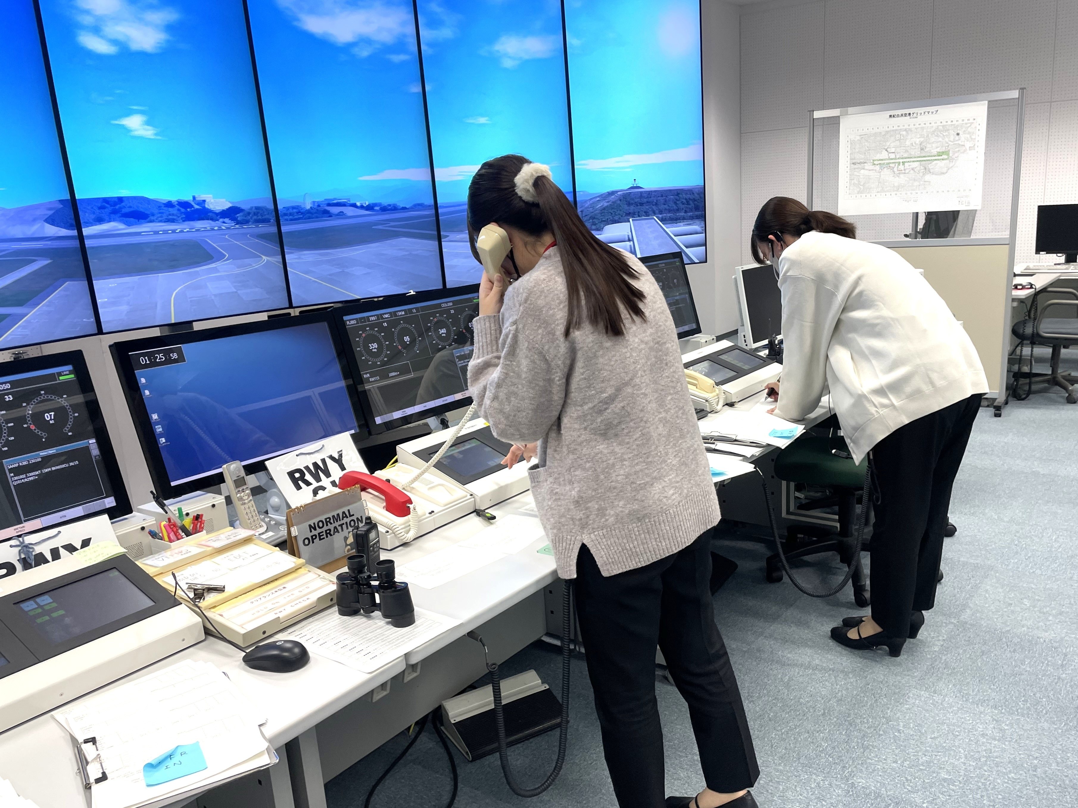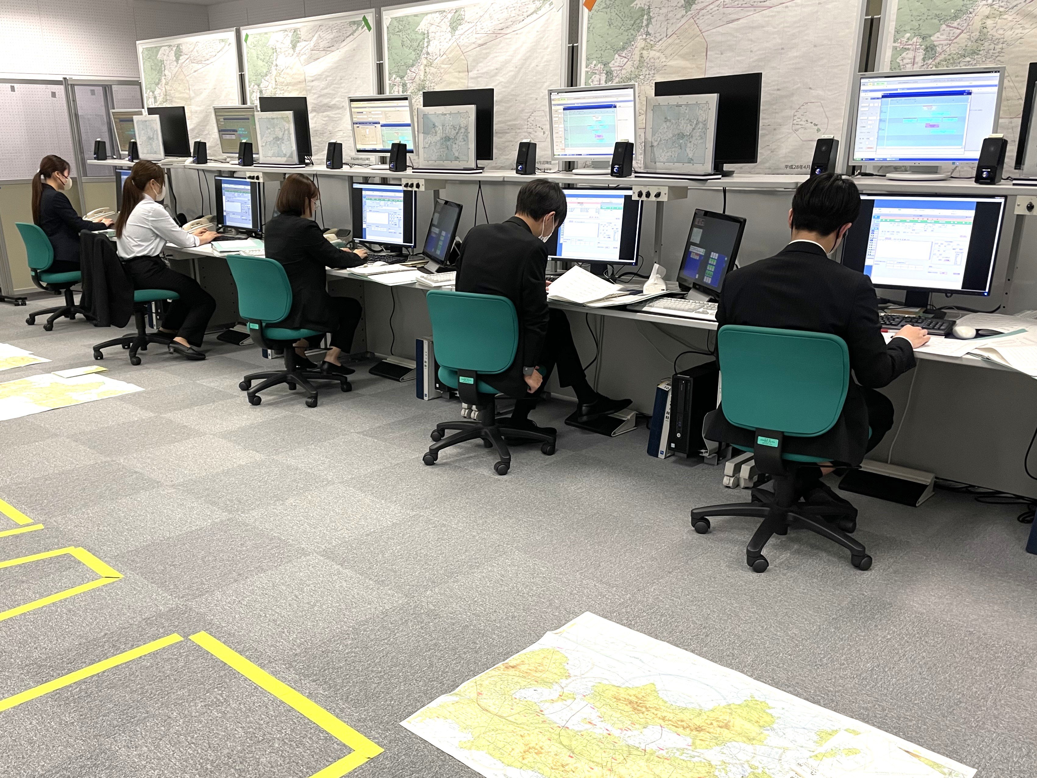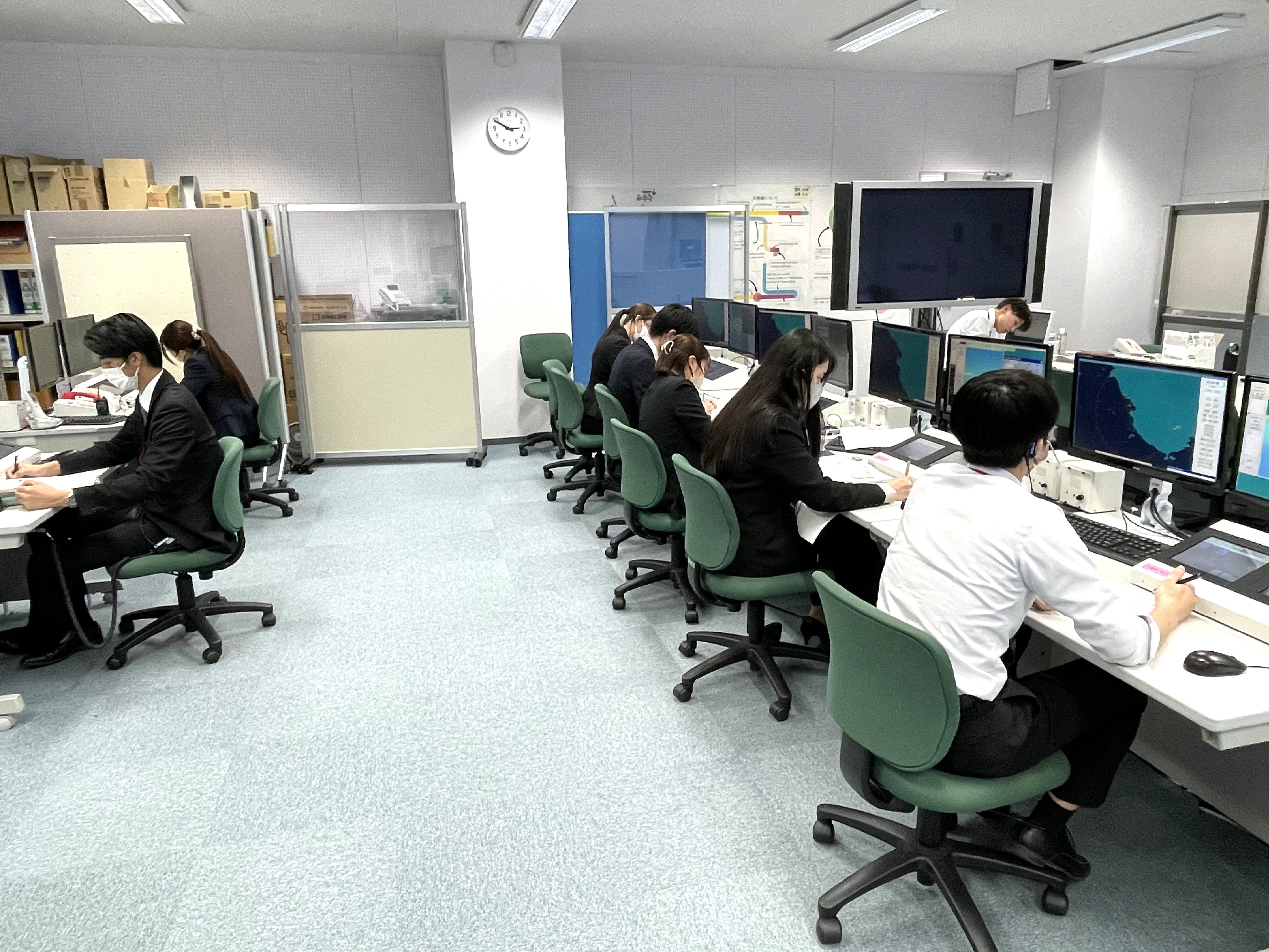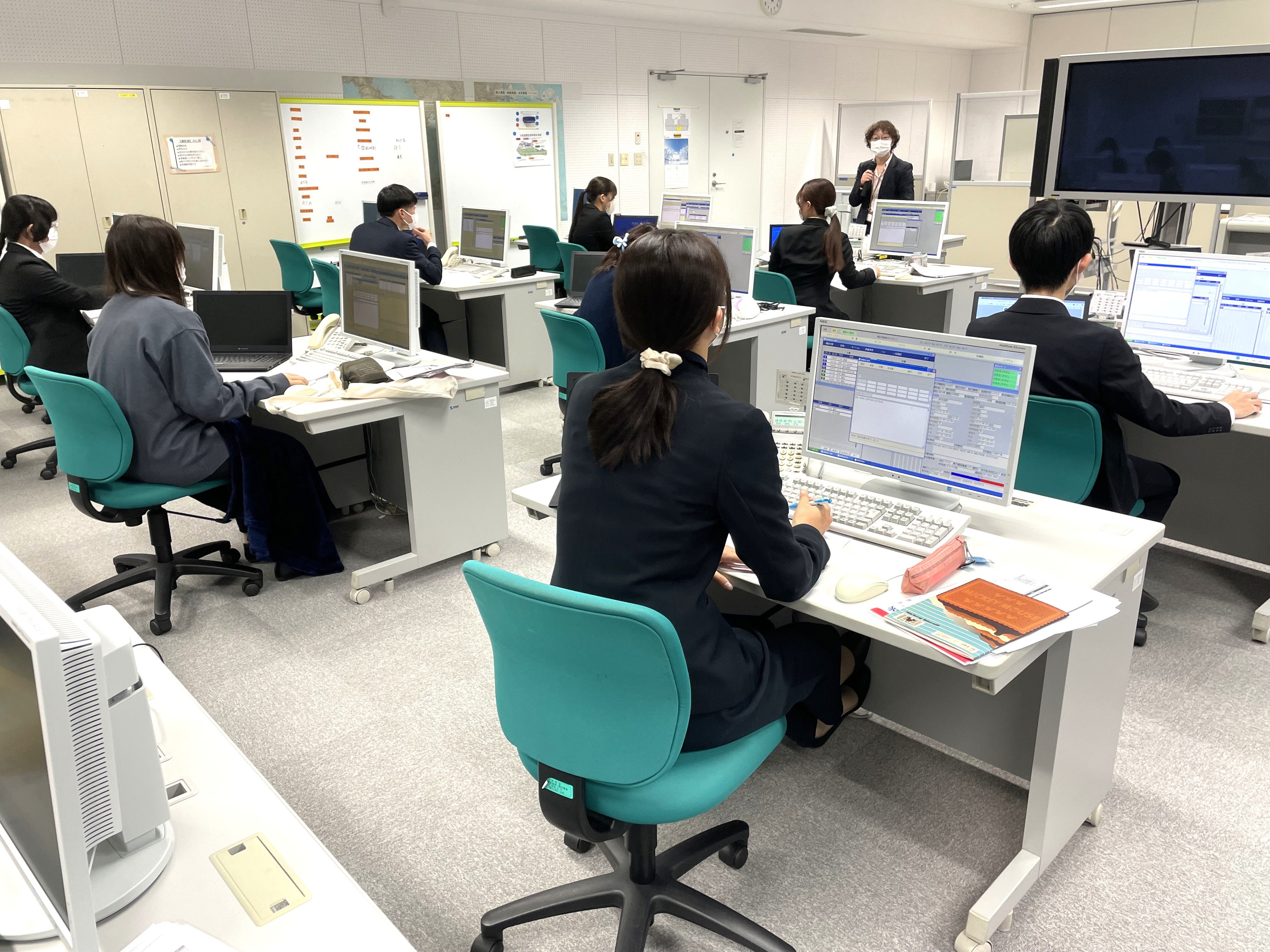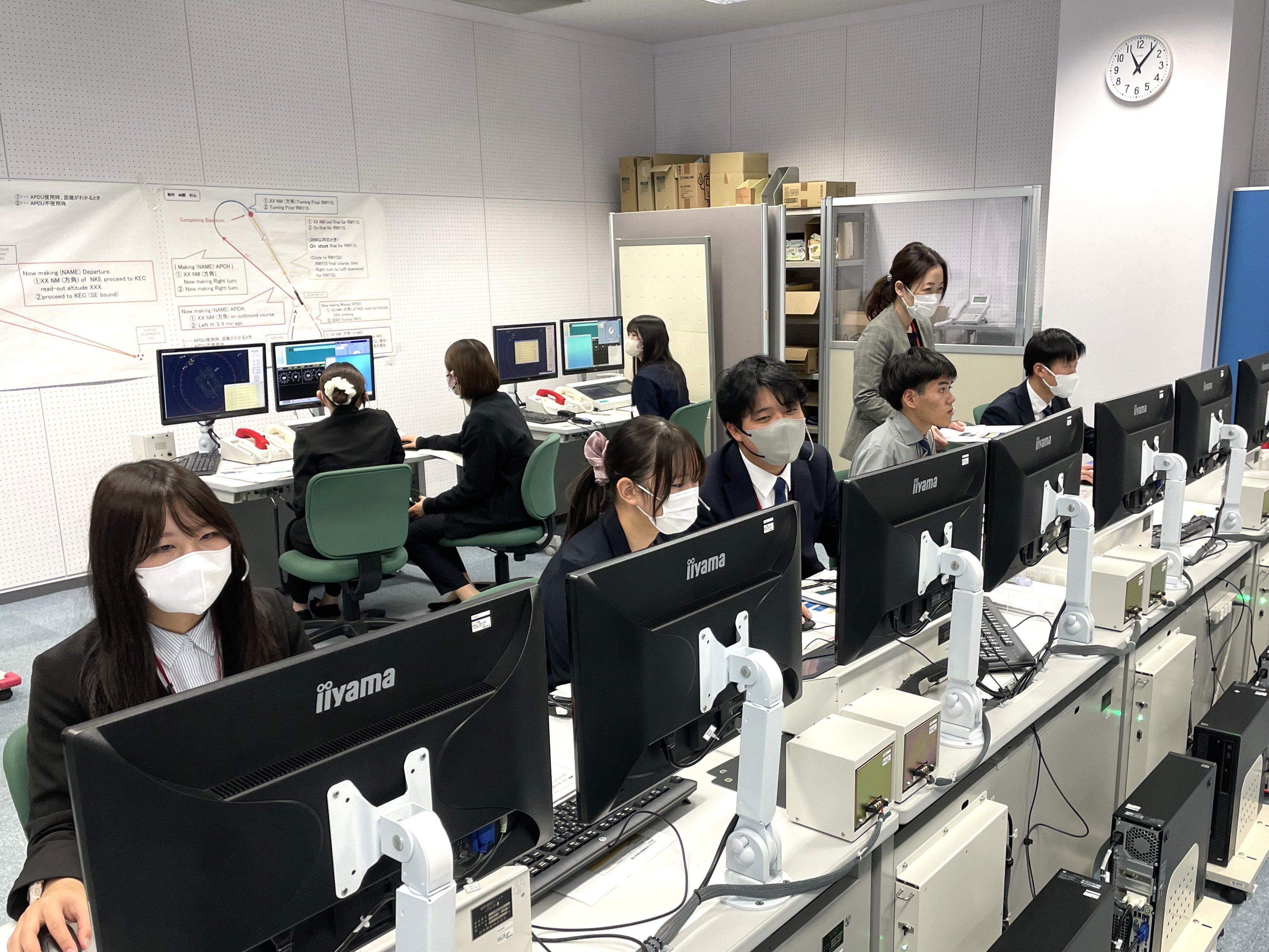 情報科1年生は「気象通報式」の学科科目において、航空管制運航情報官が行う飛行場対空援助業務及び広域対空援助業務でどのように気象情報が提供されているかを知るために、情報科2年生の科目である「飛行場対空援助演習」及び「広域対空援助演習」を体験しました。