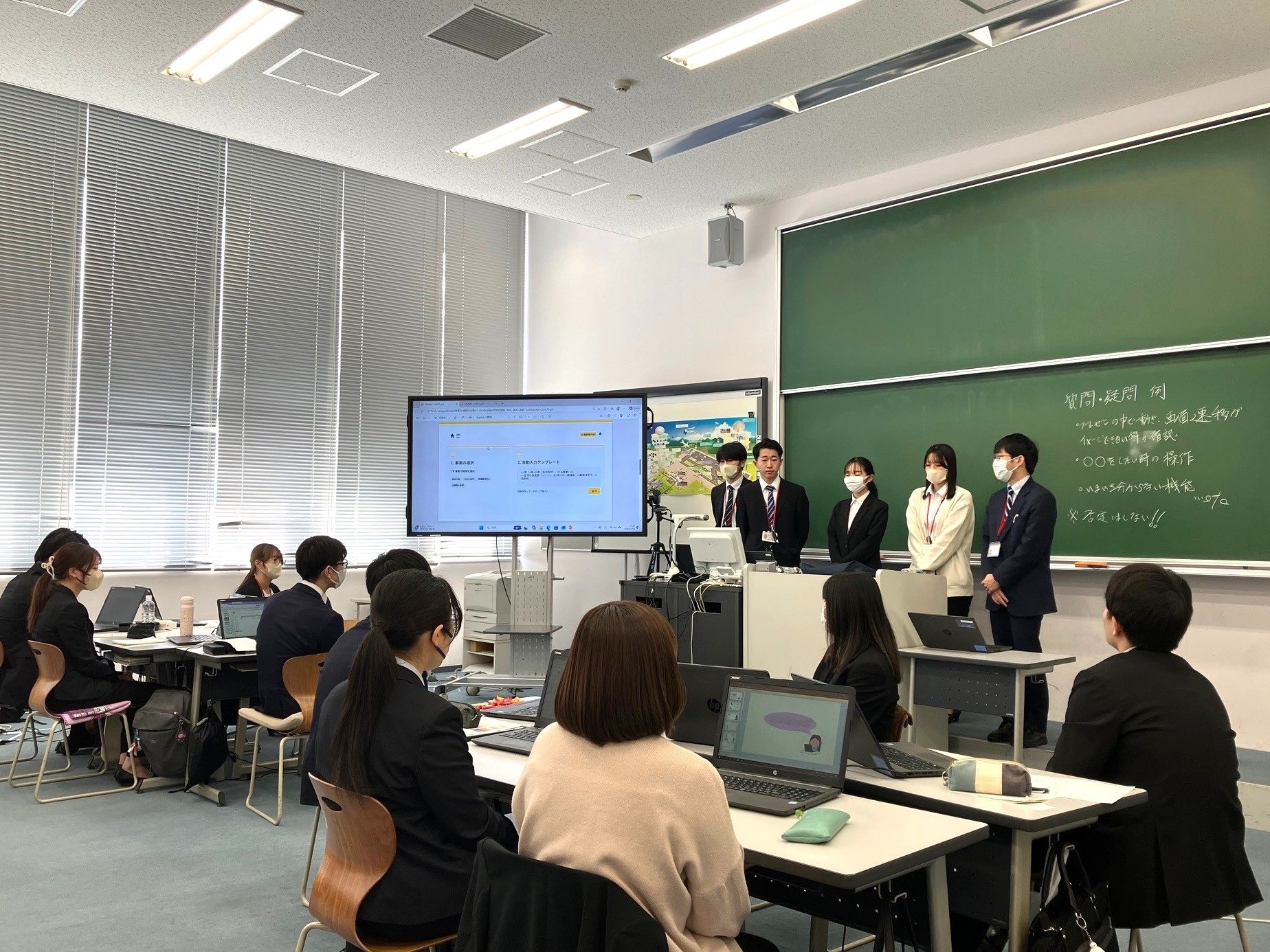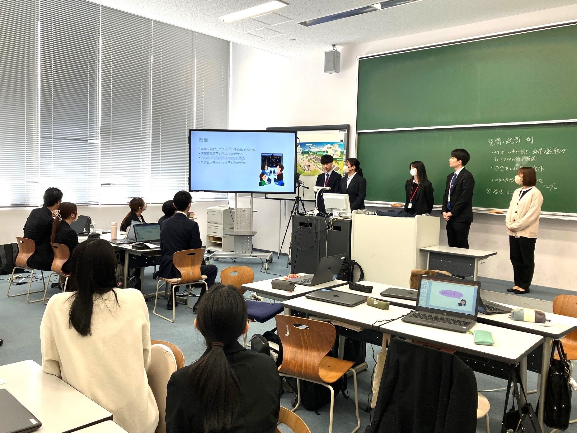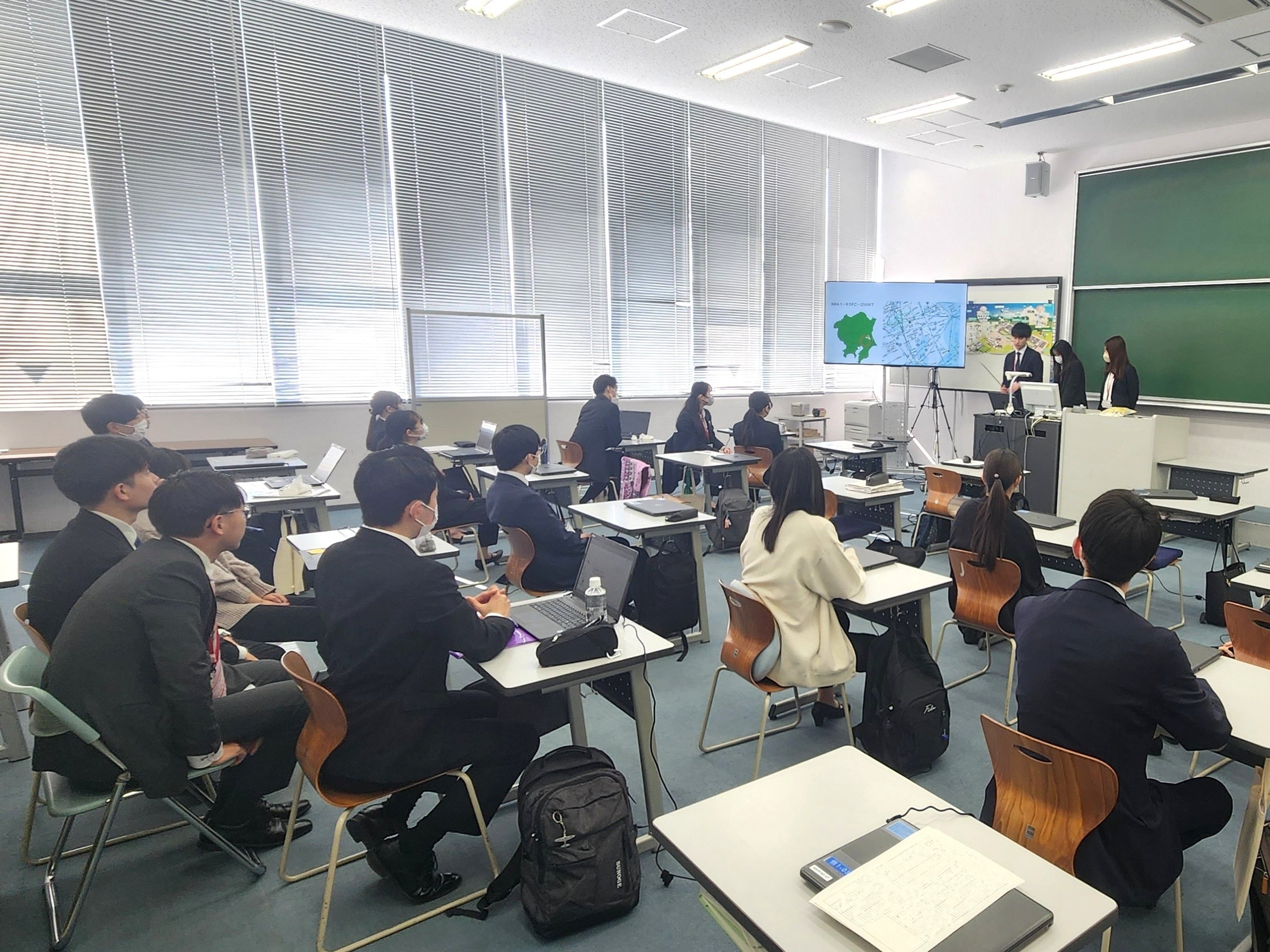 情報科2年生は「科目演学」の学科科目において、約2年間、授業や演習を通して学んだ運航情報官が行う業務について、業務パフォーマンスがさらに向上するようなツールを情報サービスマネジメントの観点から、グループ毎に考えて発表しました。