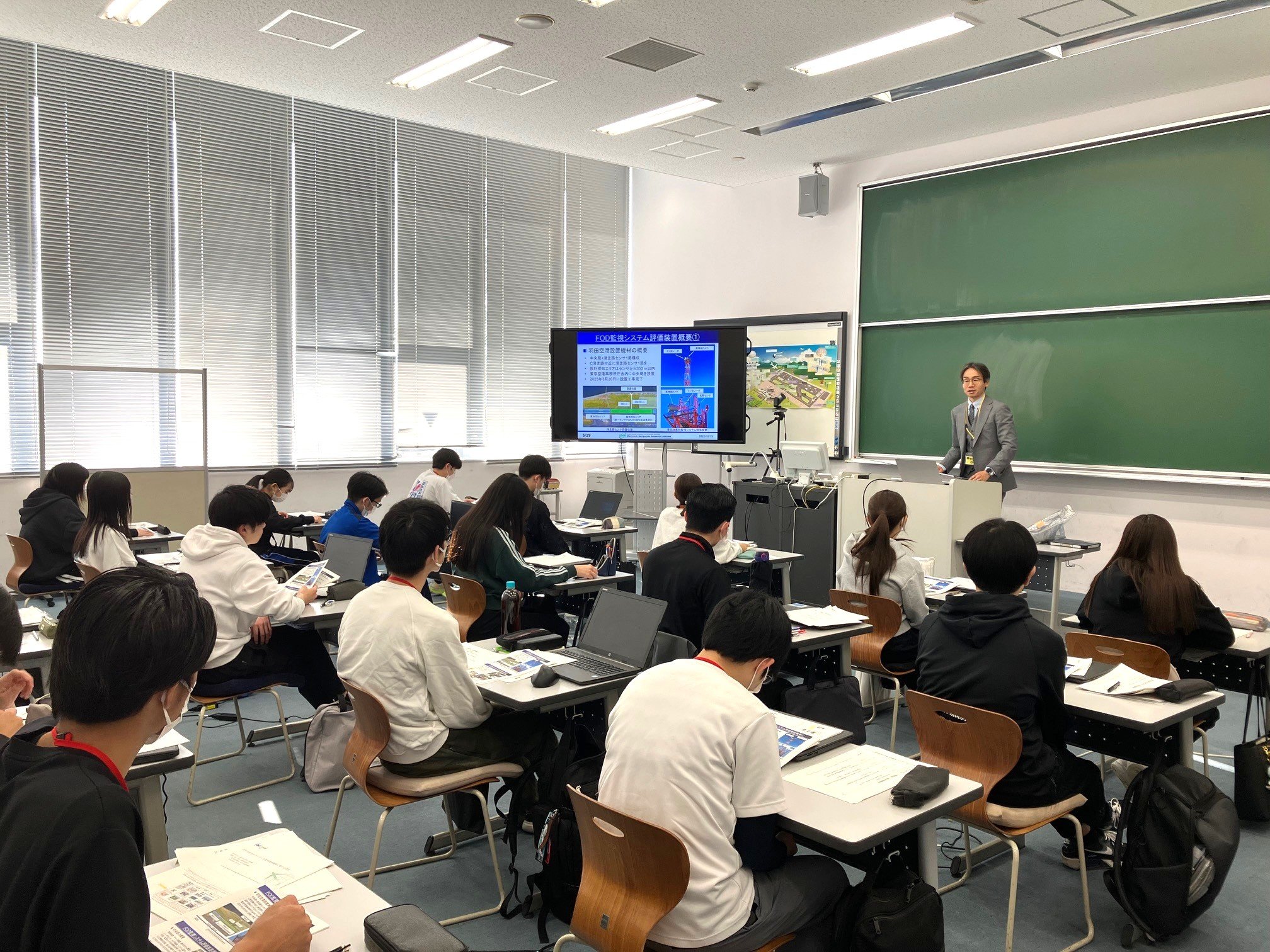 情報科1年生及び2年生は「科目演学」の学科科目において、航空局交通管制部運用課の運航情報調査官から航空情報科の学生が将来従事する業務や今後のキャリアパス等の講義を受けました。