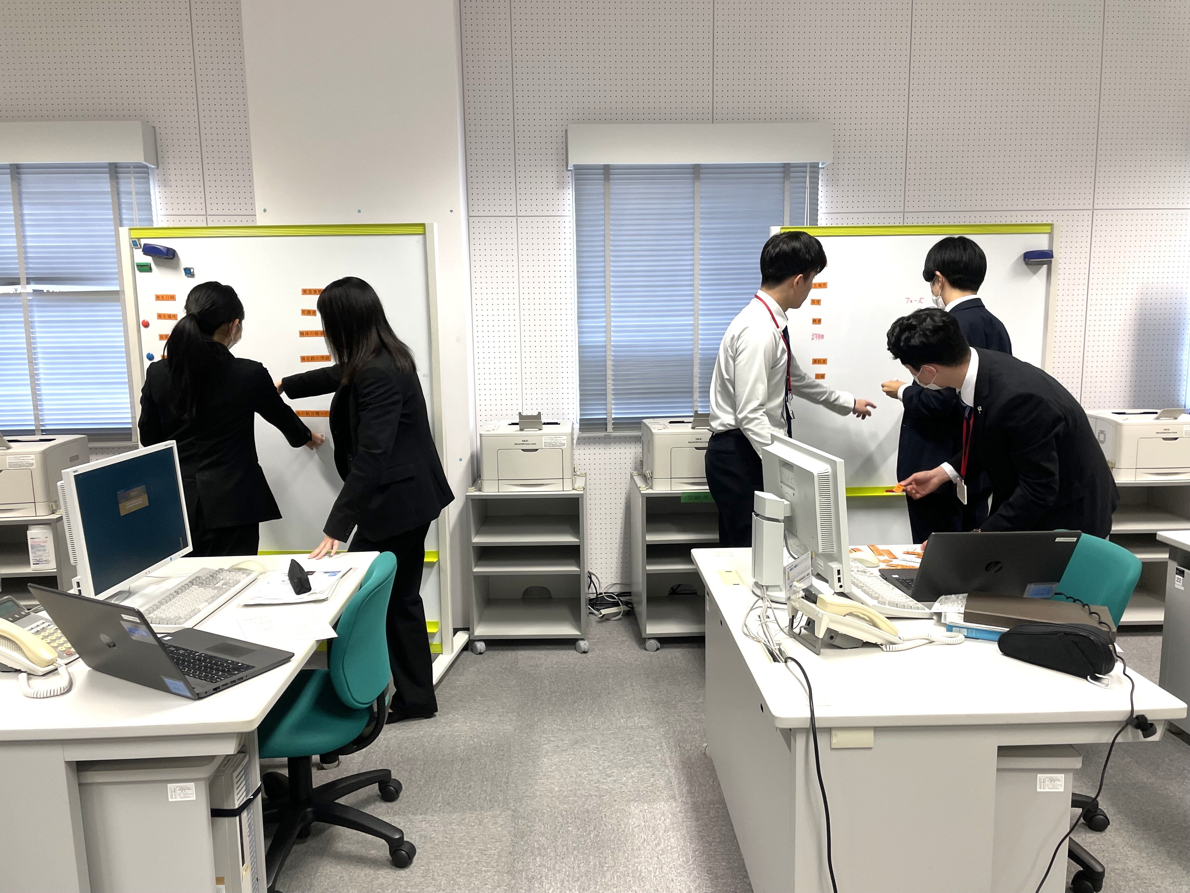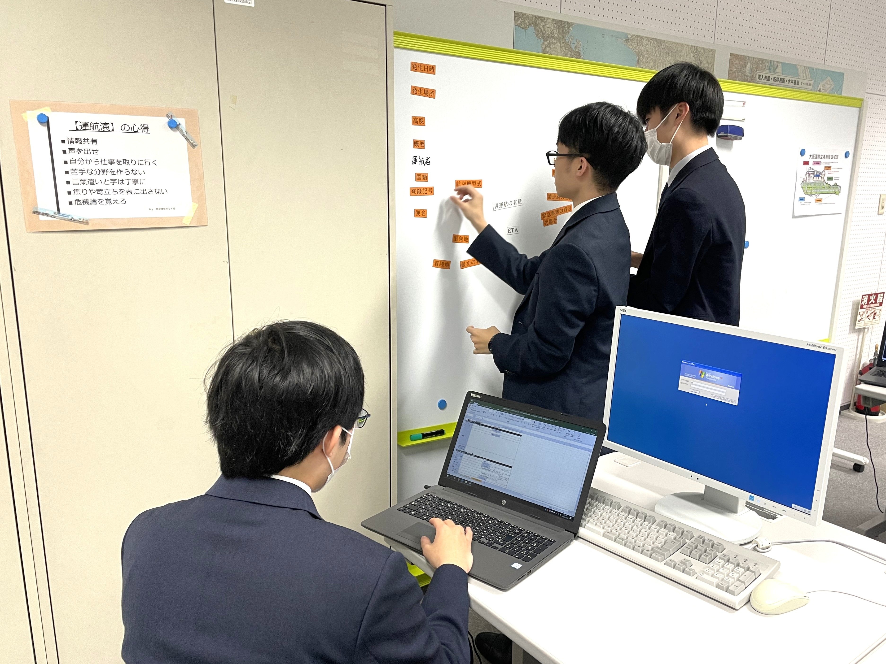 情報科2年生は「運航援助演習」の実技科目において、運航中の航空機が出発地に引き返す等の事案が発生した場合の対応として、入手した情報を整理するためのホワイトボードを準備しました。