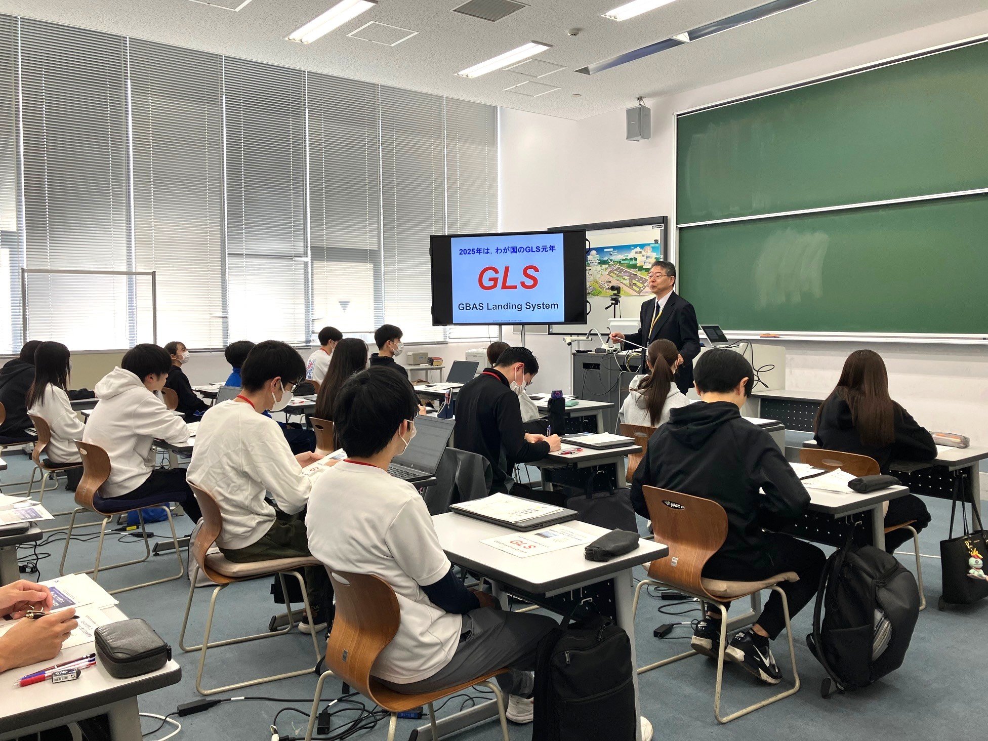 情報科2年生は「公務員教養」の学科科目において、電子航法研究所の職員を講師として迎え、GBAS(地上型衛星航法補強システム)を活用した着陸運用の高度化に関する講義や次世代航空モビリティ(ドローンや空飛ぶクルマといった新たな航空機)の運用環境構築に関する講義を受けました。