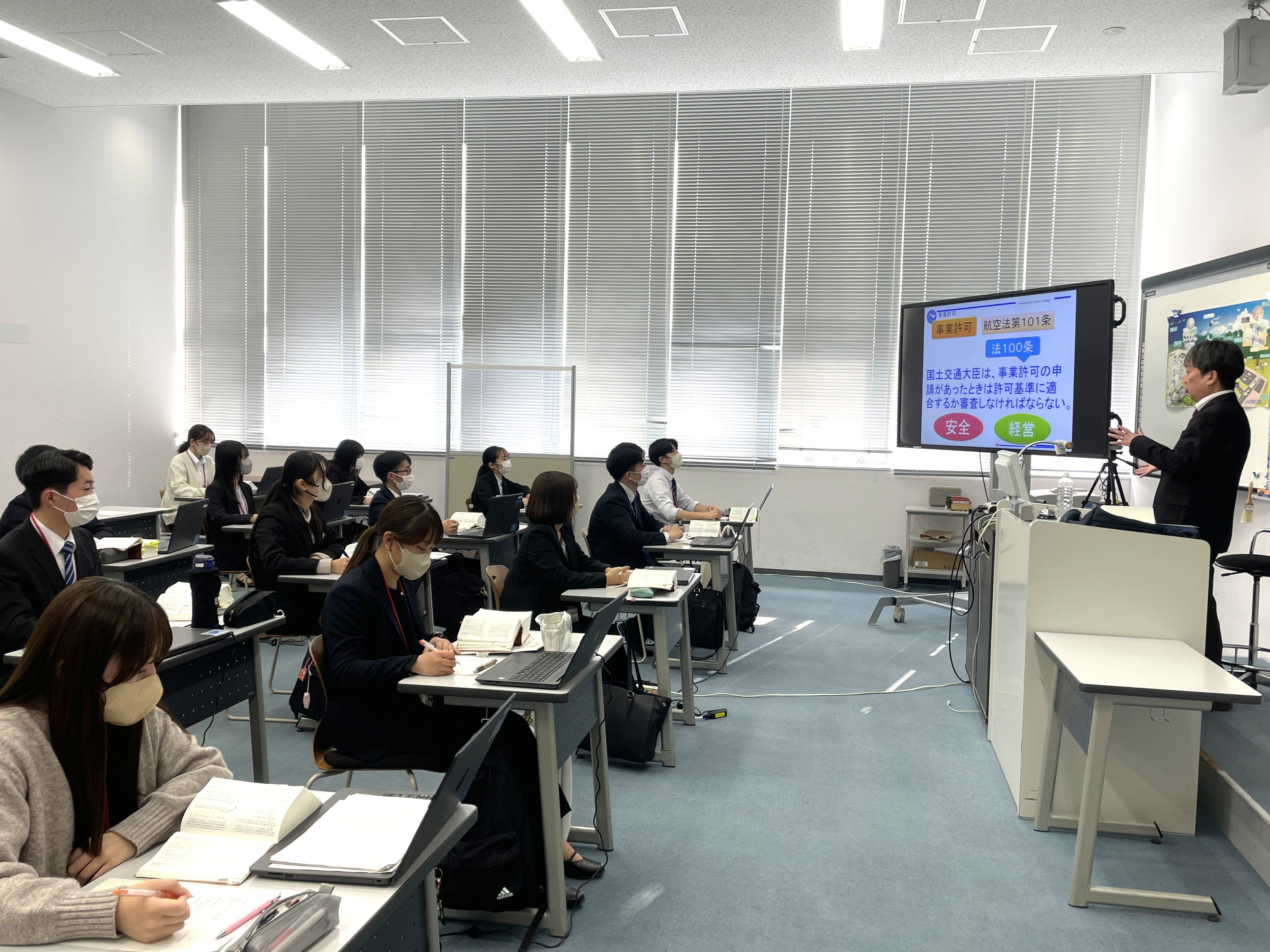 情報科2年生は「運航監督概論」の学科科目において、本邦社(日本の航空会社)が航空運送事業(航空機を使用して有償で旅客や貨物を運送する事業)を経営しようとする場合は航空法第100条により国土交通大臣から許可を受ける必要があり、航空法第101条に基づき行う審査について学びました。