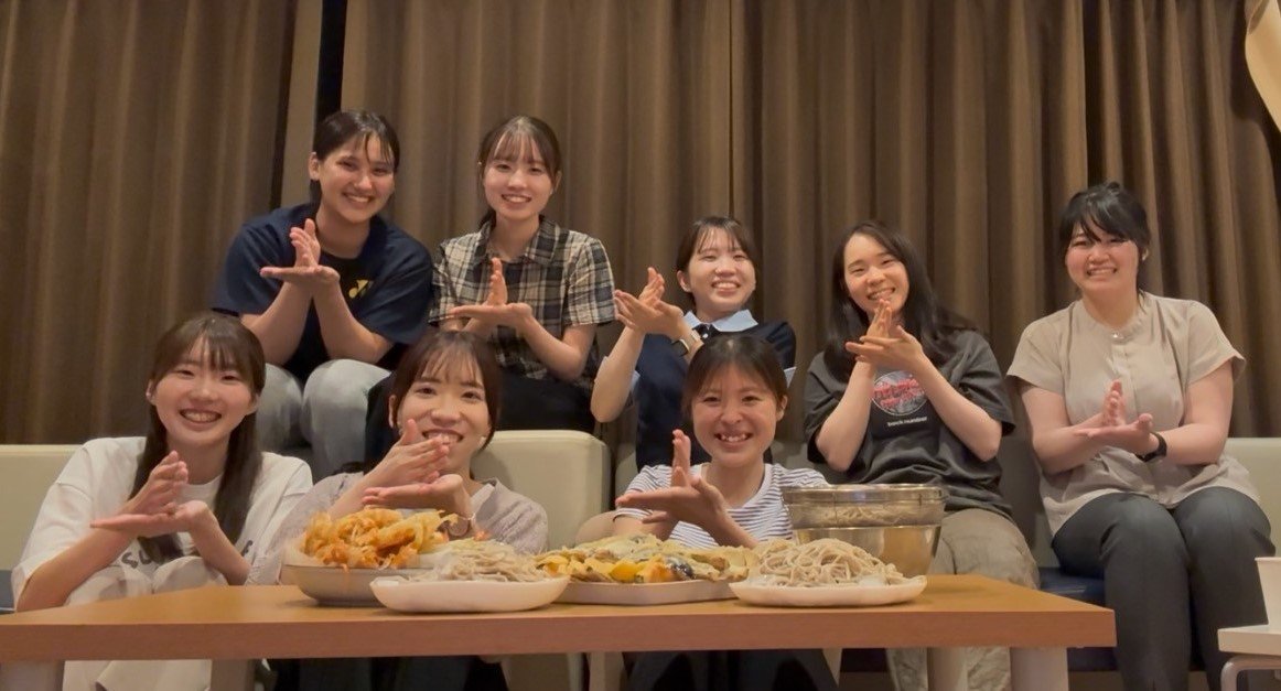 今回は、蕎麦打ち名人の教官が打った手打ち蕎麦が差し入れされ、7月生まれの学生のお誕生日を同期女子全員でお祝い。